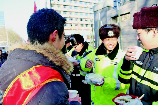 21日,山师化学化工与材料科学学院2014级化学2班的齐鲁志愿者开展了“冬至温暖行”活动。50位师生在学校食堂手工包饺子,并将热腾腾的饺子送给了宿管老师、环卫工人、交警和协警等。 本报记者 肖龙凤 实习生 张艺迈 王静 摄