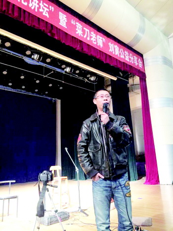 “菜刀老师”刘寅在山东工商学院同大家分享他的公益道路。 躁动社供图