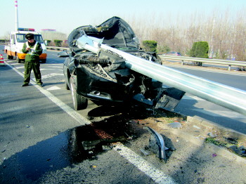 本报12月22日热线消息(记者 王琳 通讯员 李吉平)22日中午,一辆黑色轿车在青银高速和长深高速变道交汇处,撞上了路边的隔离护栏,整个车头被撞烂,幸好司机没有受伤。据司机自己反映,因为对高速路况不熟悉,所以一路开着导航,行驶中车速较快而导航有所延误,所以在变道时急打方向盘撞上了护栏。