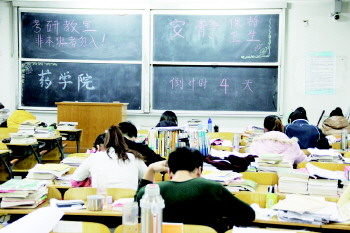 教室黑板上写有“考研教室”、“倒计时几天”等字样,时刻提醒学生。