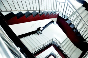 图书馆楼梯处,一名考生坐在楼梯上复习。