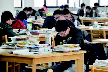 聊城大学逸夫图书馆内,考生们在抓紧复习备考。