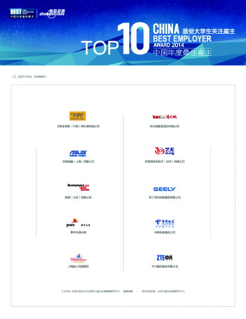 近日,被誉为人力资源行业“奥斯卡”的智联招聘2014中国年度最佳雇主评选活动在三亚圆满落幕。联想集团、中国电信、艾欧史密斯、吉利汽车、中兴通讯、普华永道、华硕电脑、阳光城集团、艺龙旅行网、上海迪士尼度假区等10家企业获得了“最受大学生关注雇主”称号。