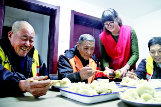 12月22日是二十四节气中的冬至,塔山社区居民殷树山夫妇和塔山中学的学生们一起包饺子,邀十余名环卫工人来到活动室一起吃热腾腾的饺子。