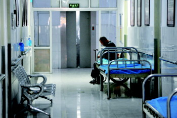 由于无亲属看护,无主病人窦某孤独的待在医院走廊里。