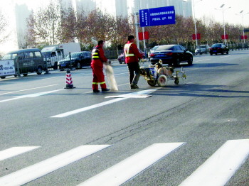 为使交通标识更加清晰,12月22日,在东风路上,工作人员对道路交通线重新施划。 本报记者 孙婷婷 摄