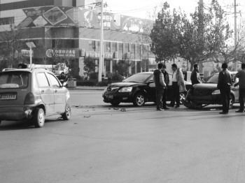 12月23日中午,在晶华大道与三八东路十字路口,一辆从晶华大道左转弯的电动汽车,与自南向北直行的两辆私家车相撞,影响了正常的交通秩序。 本报记者 孙婷婷 摄