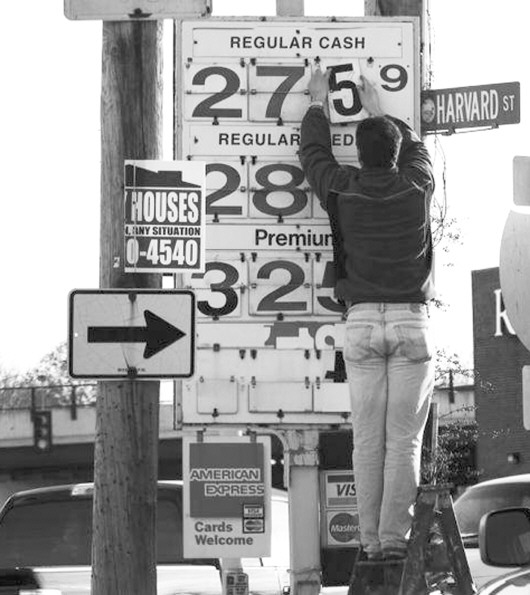 12月4日,美国马萨诸塞州一家加油站的工作人员在更改油价。