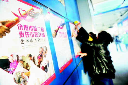 本报12月24日讯(记者 蒋龙龙 孟燕 王倩) 济南市第三届责任市民暨最佳公共服务奖评选正式启动后,越来越多的市民参与到爱心大传递活动中。24日,本报印制的爱心海报贴到了BRT站台、济南水务客服大厅、济南热力客服大厅。截止到下午6点,百余份海报已经被市民免费领走。