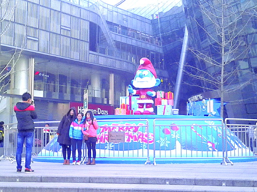 泉城路上,蓝精灵穿上了圣诞装,吸引不少市民拍照留念。