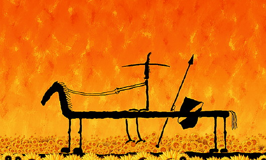 一天,堂·诘诃德来到一个乡村客店,他却把这个客店当作城堡,把老板当作城堡的主人,要求老板封他为骑士。老板有意捉弄他,拿记马料账的本子当《圣经》,用唐·吉诃德的刀背在他肩膀上着实打了两下,然后叫一个补鞋匠的女儿替他挂刀。受了封的骑士堂·吉诃德走出客店把旋转的风车当作巨人,冲上去和它大战一场,弄得遍体鳞伤。这就是有名的堂·吉诃德大战风车。