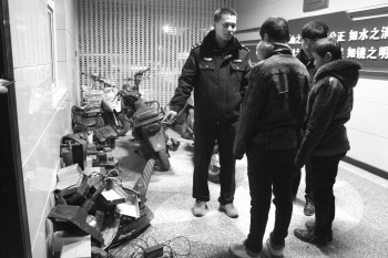 民警在收缴的赃物前训诫两名少年。 本报记者 岳茵茵