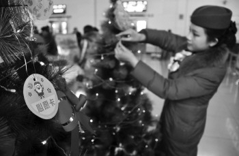 24日上午,济宁汽车总站候车厅,两棵彩灯闪烁的圣诞树衬托出浓浓的节日气氛。这两棵漂亮的圣诞树不仅用来观赏、装扮,而且还是一棵可以许愿的心愿树。