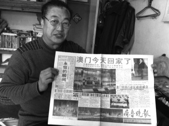 2014年12月20日,是澳门回归中国15周年纪念日。陈华昌专门从书柜中找到1999年澳门回归专题的报纸,大题目是“澳门今天回家了”。“那时候的报纸版面比现在小,除了大标题是红字,图片还都是黑白的,如今看上去很有历史感。”时隔15年后,陈华昌再拿出当时的报纸,犹如回到了15年前。