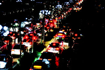 12月24日平安夜,湖滨大道明月湖风景区附近出现严重堵车,一般正常通行需等待七八个信号灯。 本报记者 马志勇 摄