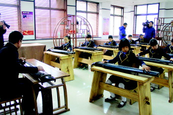 ▲在尼山书院的文化活动体验室内,学生们在跟老师学习古琴。