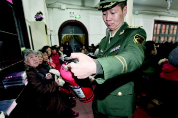 24日19时,圣诞、元旦消防安全“零点”夜查行动正式启动。记者跟随市北消防大队执法人员,首先来到位于台东三路附近的一处教堂。当晚,教堂内人头攒动,异常热闹。消防人员仔细检查消防栓、灭火器、逃生通道后,发现只有个别灭火器压力不足。“一定要注意及时更换或补充气压,否则到了关键时候,可能就酿成大祸了!”虽然问题不大,但执法人员仍认真叮嘱。