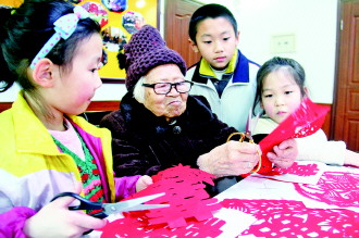 24日,东北村社区邀请92岁高龄的剪纸老艺人邵东珍教孩子们学剪纸,迎接新年到来。邵东珍老人展示了自己几十年来的剪纸作品,还手把手教孩子们剪生肖属相。