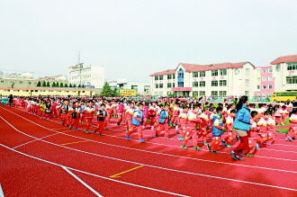 ▲文登区河南小学学生在刚投入使用的塑胶场地上跑操