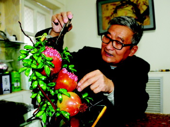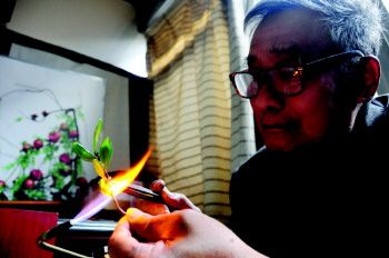▲王乃宝大师在精心烧制琉璃石榴的树枝。
