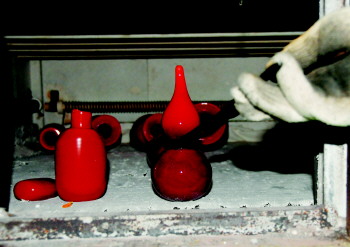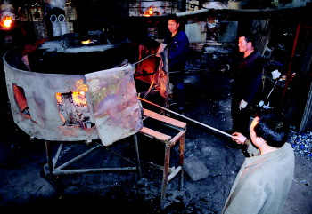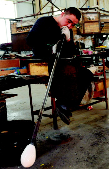 ▲加工师傅正在用回温炉给制作过程中温度降低的琉璃加热。