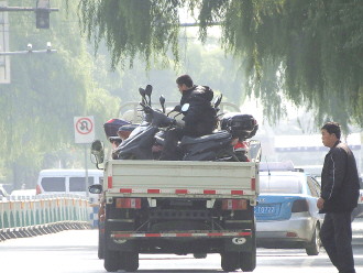 时间:2014年10月11日  自述:客货车拉了很多电动摩托车,而电动摩托车上还骑坐着一位男子。 点评:货车坐出了客车的赶脚。