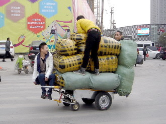时间:2014年12月10日 自述:小小平板车堆满了货物,车上的小伙子还一个比一个冒失。 点评:不把安全当回事。