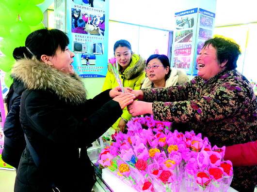 义卖现场,很多好心人捐款后只是象征性地拿朵花。 本报记者 程凌润 摄