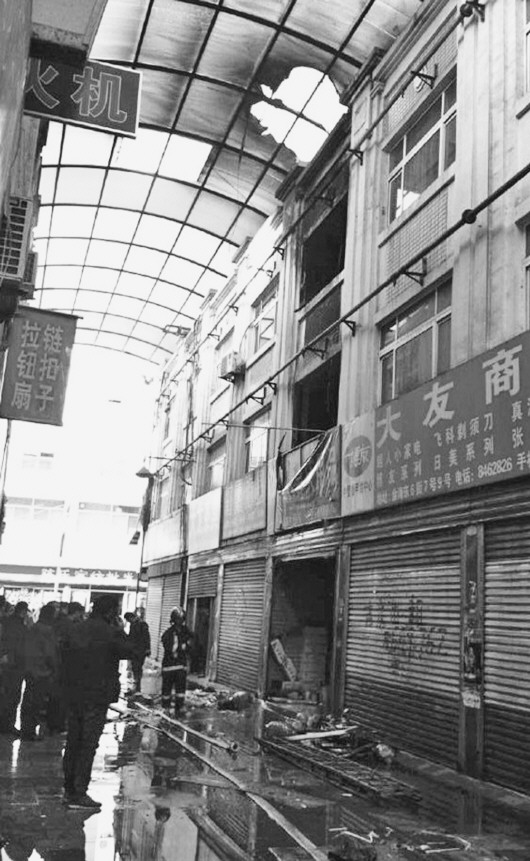 着火店铺二楼和三楼的窗户已被烧掉,市场顶棚被烧出一个大洞。 本报记者 王传胜 摄