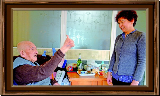今年上半年,在房泽秋家中,当着记者的面,李玉柱老人(图左)高高跷起大拇指感谢房泽秋(图右)多年的照顾。