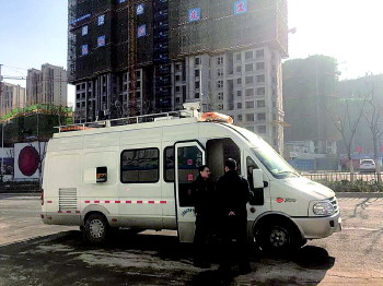 ▲25日上午,道路扬尘检测车正在工地检测扬尘。