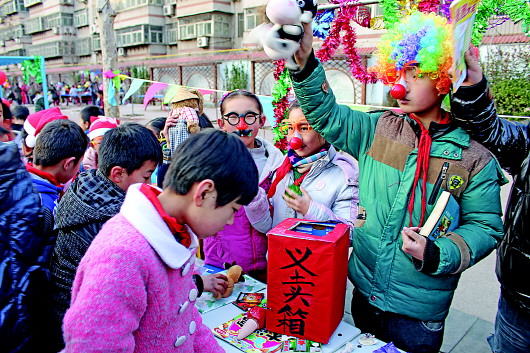 25日圣诞节当天,济南市天成路小学开展了第一届“红鼻子”义卖活动,为青海共和县倒淌河镇民族寄宿制小学的小伙伴献爱心。 本报记者 李飞 摄