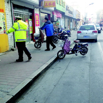 记者看到,少部分商家虽然将用来占用公共停车位的“油桶”等搬离,但仍然用电动三轮车等占用车位,希望能蒙混过关。民警只得挨个进入每家店铺寻找车主,劝告车主将电动三轮车搬上路牙石停车。