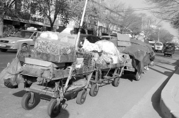 12月25日,在迎宾大道上,一辆三轮车拖着两个货箱在路上行驶,犹如一列小火车。