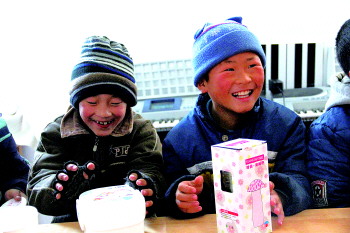 拿到礼物的孩子们高兴得合不拢嘴。