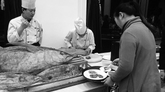23日夜,各餐饮企业纷纷打出特色招牌吸引顾客,一搏“平安经济”。在某宾馆,一100多斤的金枪鱼摆上了餐桌,供顾客免费试吃。