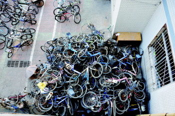 山东理工大学一公寓楼角处堆满了废旧的自行车。25日,记者走访淄博多所高校发现,不少公寓楼下和停车场都有一些“僵尸”自行车,这些自行车多无人认领,长期被丢弃,不仅占用空间,还浪费资源。而对于如何处理这些车子,现在并没有好办法。 本报记者 王鸿哲 摄影报道