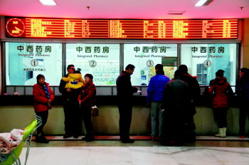 12月28日,人民医院取药窗口前循环播放的药品价格公示。 本报记者 马志勇 摄