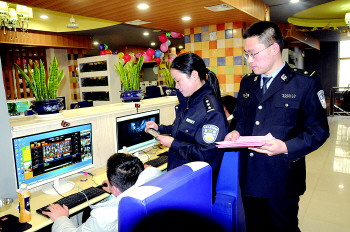 每到一个网吧,执法民警都认真核查网吧的上网人数以及上网人员身份情况,并要求各网吧经营者要坚决杜绝网吧存在着容留未成年人上网的现象。同时,为更好地对各网吧经营场所的营业状况进行实时监控,民警还对各网吧的视频监控系统、上网人员信息系统进行了检查,对发现的问题及时要求业主予以整改。图为:巨野县公安局网络监察大队民警深入到网吧核查上网人员登记信息情况。