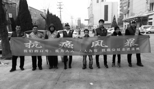 本报12月29日讯(记者 谭正正) 28日,一个名为“抗癌公社”的公益组织落地滨州,公社成员的首次活动便走上街头向群众宣传。公社滨州负责人付利群介绍,加入抗癌公社的正式成员一旦患癌,每一位成员都要为其进行小额捐款,这让抗击癌症变得不再是一个人或是一个家庭的事。