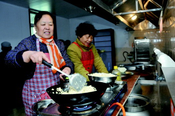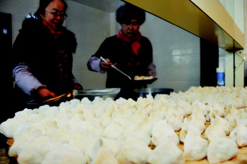 10时,大家都来到新建成的社区餐厅,将自家做的菜摆上桌,随后,开始包饺子,有的拌馅,有的和面擀皮,忙得不亦乐乎。