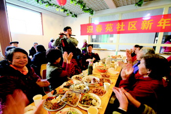 一切准备就绪后,音乐响起来,居委会主任简短的新年致辞、发出“开吃”的口令后,大家伙儿吃自助餐似的围着长桌,舞动双筷享受“舌尖上的美味”。不少居民端着碗筷串桌品尝,吧唧着嘴,连称“好吃”“真香”!席间,还不时有居民表演节目助兴。