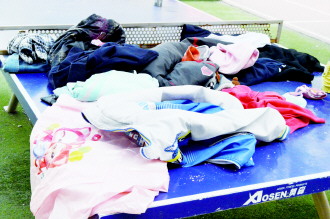 小学生丢失的衣物,都摊开放在了乒乓球台上。 本报记者 杨霄 摄