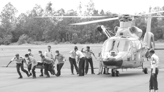 2014年12月31日,在印尼中加里曼丹省邦加兰布翁,救援人员将遇难者遗体从直升机搬运到救护车上。 新华社发