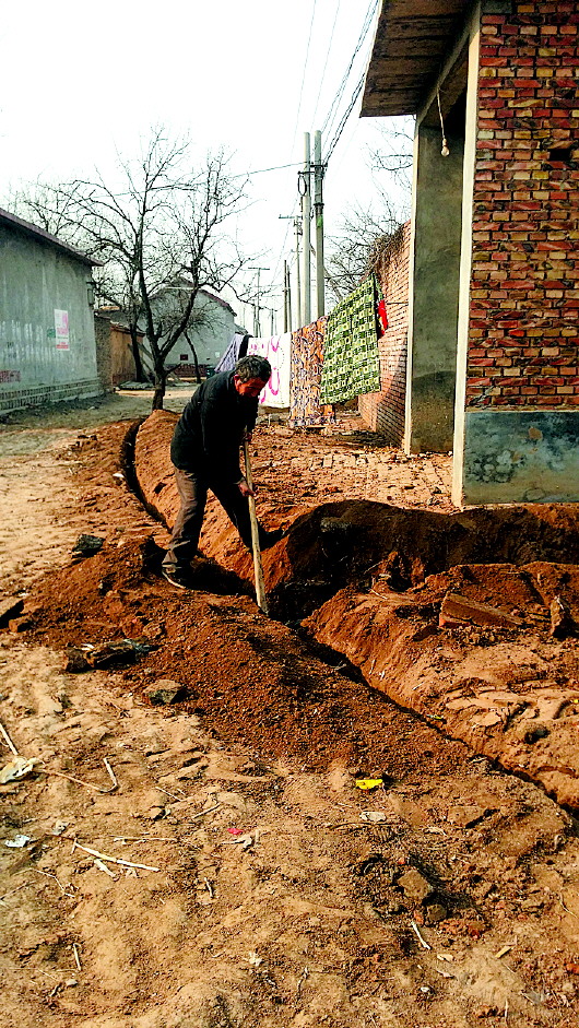 村民挖门前自来水管道。