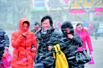 2014年最后一天下午,市区降雪。15时20分许,雪势增大,市区统一路上,市民冒雪前行。