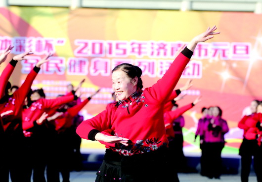 1月1日,大明湖超然楼前,来自济南各区的大妈大爷们跳起健身舞,用全民健身活动迎接新年。