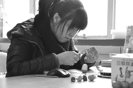 丁姣在工作室里做黏土作品。 本报记者 谭文佳 摄