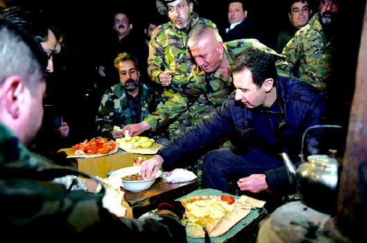 据新华社消息 叙利亚国家电视台1日报道,叙总统阿萨德在新年前夜赶到首都大马士革东部的朱巴尔区,视察驻守在当地的政府军和支持政府的武装人员,并共进晚餐。