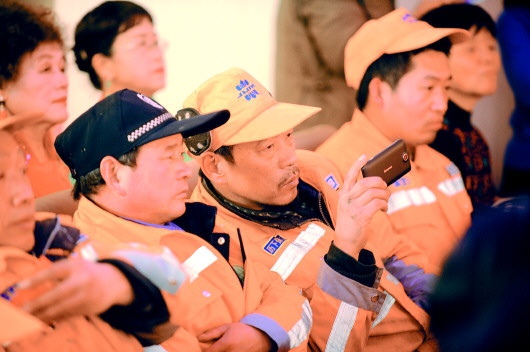 环卫工们看到精彩处,不时拿出手机拍照录像。